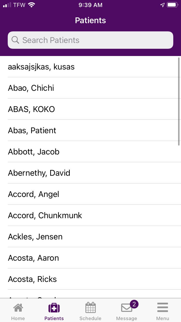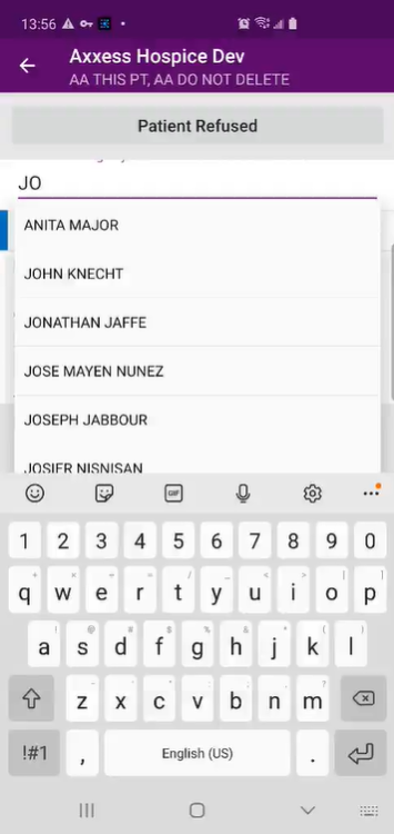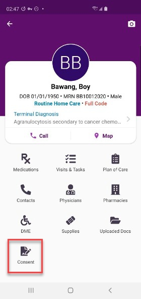 To view, track and complete patient consents on the Axxess Home Health mobile app, navigate to the Patients menu to search for and select a patient. Patients in Active and Pending status are searchable.