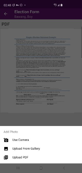 Tap Use Camera to take a photo of the signed consent form, or select Upload from Gallery or Upload PDF to upload a copy of the form from your device.