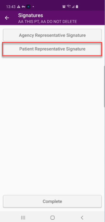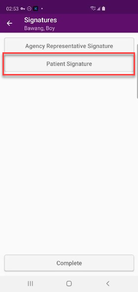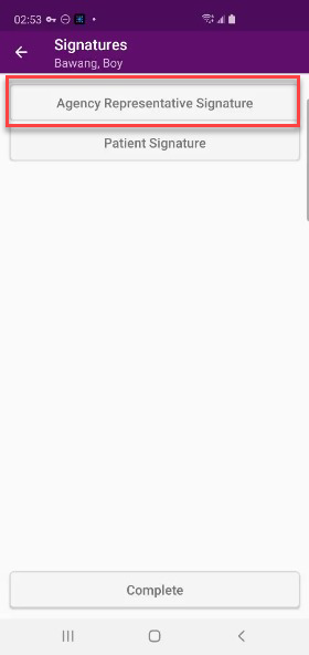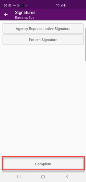 Once the agency representative signature and patient/patient’s representative signature have been collected, tap Complete.