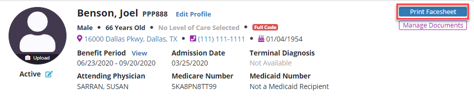 To view the face sheet PDF, navigate to the patient’s chart and click Print Face Sheet.