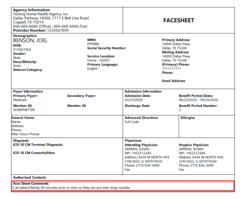 Face sheet comments appear under the Authorized Contacts section on the face sheet PDF. If comments are not entered in the Face Sheet Comments box in the patient’s profile, the Face Sheet Comments box will appear empty on the face sheet PDF.