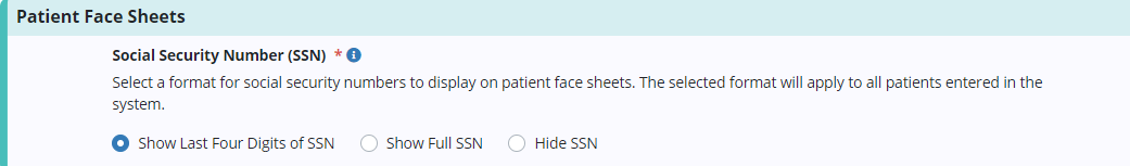 | Show Last Four Digits of SSN | Displays the last four digits of the patient’s social security number (XXX-XX-6789) | ||