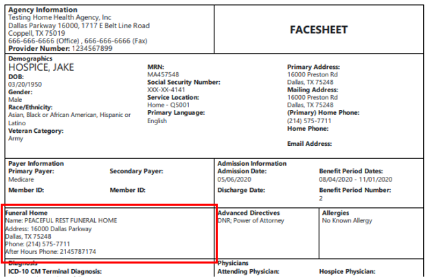 Funeral home information now appears on the patient’s face sheet when printed, to ensure that this important information is readily available to external agency partners, such as care facilities, as needed.