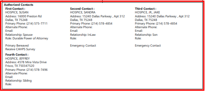 Axxess Hospice enables users to enter up to 10 authorized contacts for each patient on the Authorized Contacts tab of the patient’s chart. The patient face sheet now displays authorized contact information for each contact added for the patient. Authorized contacts appear at the bottom of the patient face sheet.