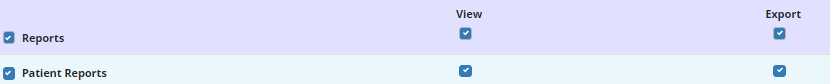 To give a user permission to view and export patient reports, edit the user’s profile and navigate to the Permissions tab. In the Reports section, select View and Export next to the Patient Reports permission. Click Save to finish granting the permissions to the user.