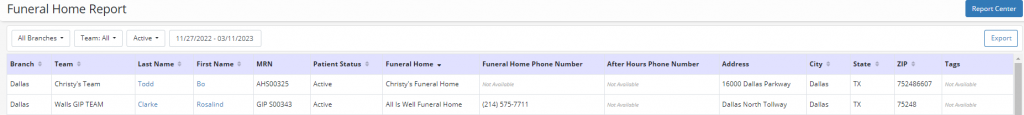 Axxess Hospice now provides a Funeral Home Report that consolidates and displays patients’ designated funeral homes and funeral home contact information. This report helps users save time and streamline operations by providing easy access to patients’ funeral home information.