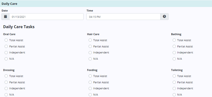 The Daily Care tab enables users to document personal care tasks performed during the shift. When documenting each task performed, users can select the level of assistance required by the patient.