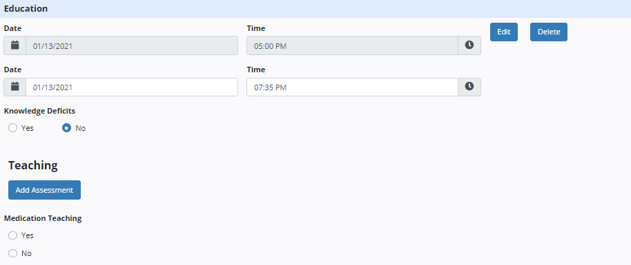 To document an education assessment, click Add Assessment. Click View/Edit to edit the date/time and enter details of the teaching performed, including knowledge deficits and medication teaching completed.