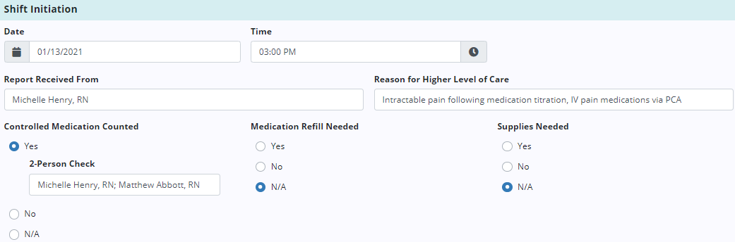 The Shift Initiation tab enables users to document tasks completed at the beginning of the shift as well as vital information, such as the reason the patient is receiving general inpatient or continuous care.
