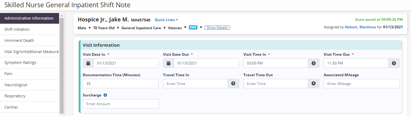 The Administrative Information tab enables users to document details about the shift. Users are required to enter the visit date, shift start time and shift end time.
