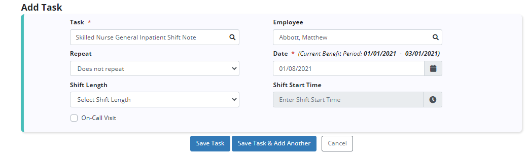 Click Add Task. From the Task menu, select Skilled Nurse General Inpatient Shift Note or Skilled Nurse Continuous Care Shift Note.