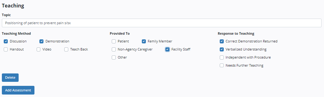 Under Teaching, click Add Assessment to add a teaching topic covered during the shift. Enter the topic, teaching method, response to teaching and the person who received the teaching. To add another topic, select Add Assessment. To remove a topic, click Delete.