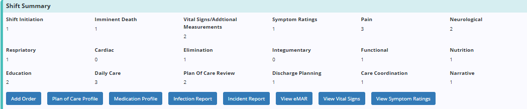 In addition to the assessment information found in other skilled nursing documentation, users can complete documentation that is unique to shift work in these notes, including shift initiation, education, daily care and discharge planning.