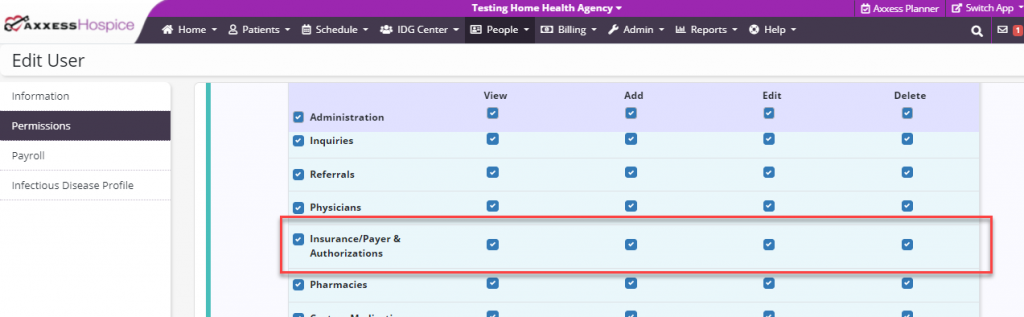 People tab ➜ People Center ➜ Edit ➜ Permissions tab ➜ Administration section ➜ Insurance/Payer & Authorizations ➜ View/Edit ➜ Save