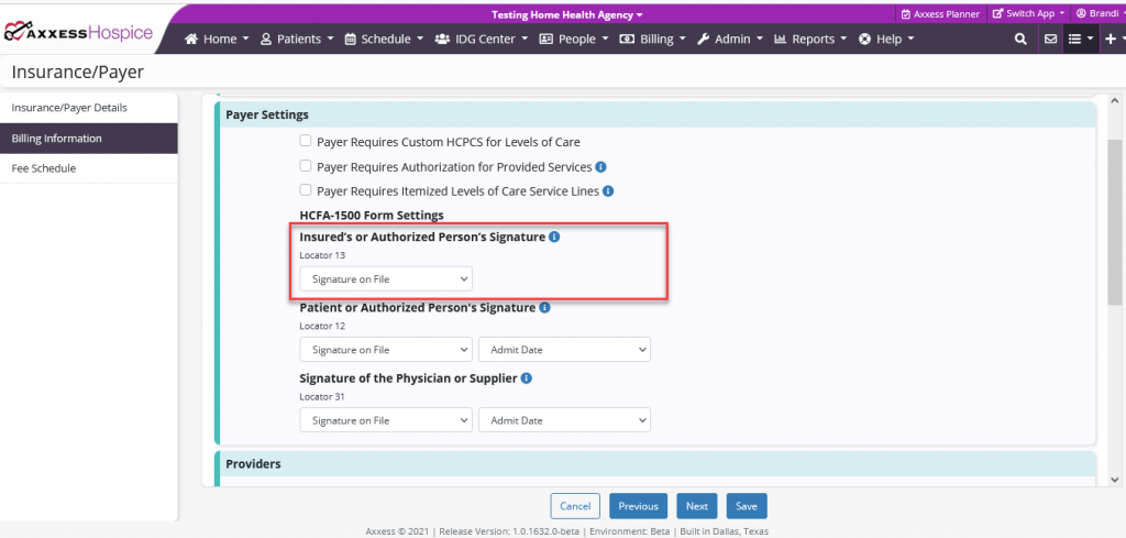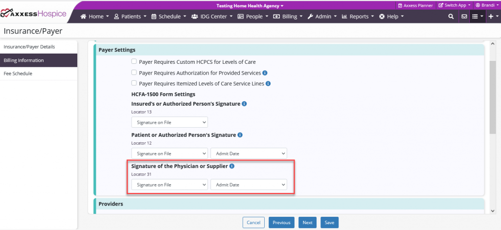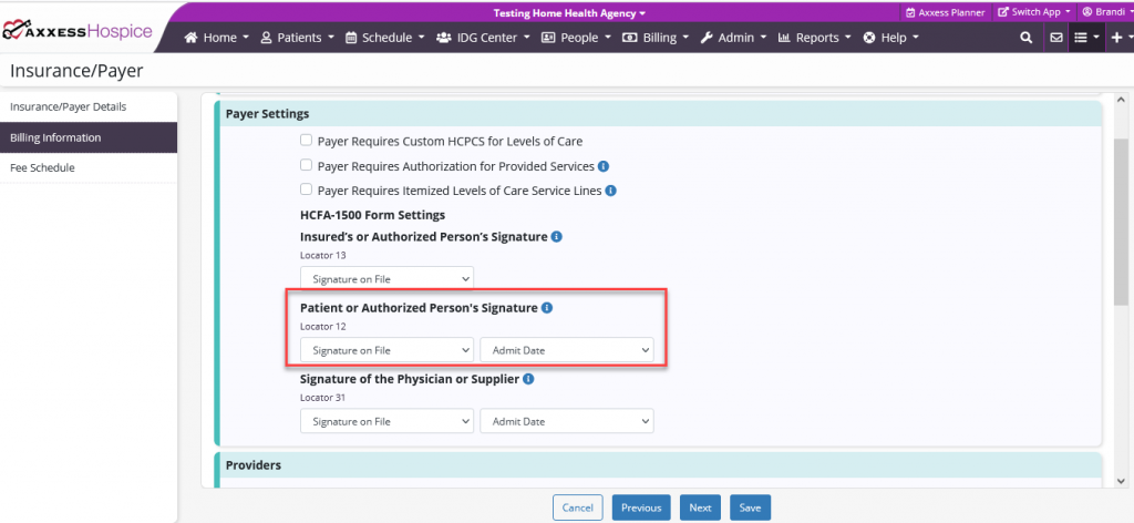 Axxess Hospice now enables users to enter and adjust settings for HCFA-1500 claims. To manage HCFA-1500 claim settings, users must have permission to view and edit insurances/payers and authorizations.