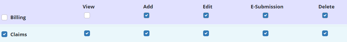 People tab ➜ People Center ➜ Edit ➜ Permissions tab ➜ Billing section ➜ Claims ➜ View/Add/Edit/E-Submission/Delete ➜ Save