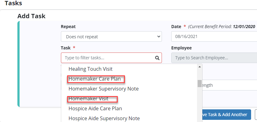 From the Task drop-down menu, select Homemaker Visit. Enter the remaining visit details and click Save Task or Save Task & Add Another to add the visit to the schedule. These visits will count against the hospice aide frequency.
