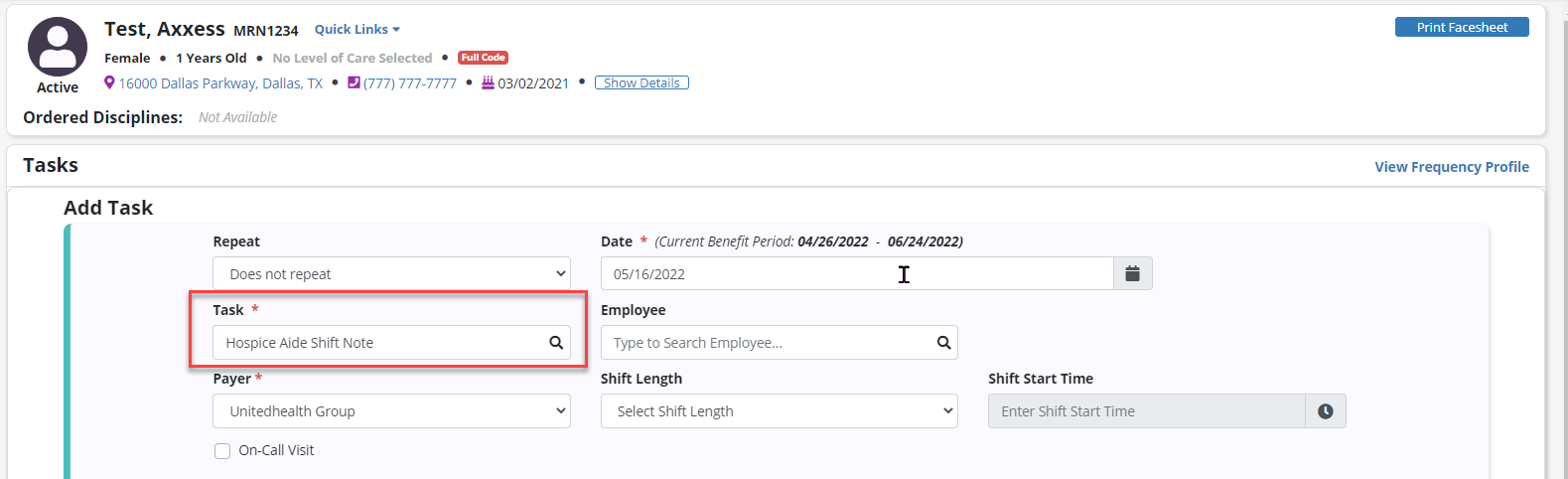 Schedule tab ➜ Patient Schedule or Employee Schedule ➜ Add Task ➜ Task ➜ Hospice Aide Shift Note ➜ Save Task