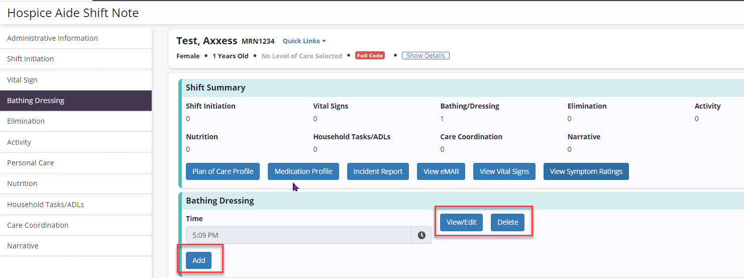 Below are action buttons that may be needed throughout the hospice aide shift. These buttons enable the user to easily view or add each action depending on the their permissions.