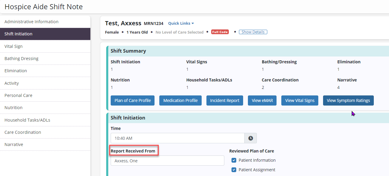 The Shift Initiation tab enables documentation of who the oncoming Hospice Aide received the report from at the beginning of their shift. This is the only section that allows for one entry.