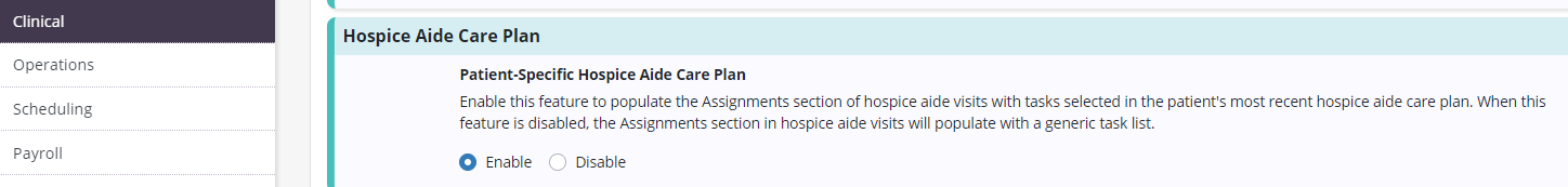 Enabling this feature will populate the Assignments section of hospice aide visits with the most recently approved aide care plan for the respective patient.