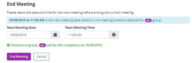 Select the purple End Meeting button to end the meeting and create the next meeting, agenda and IDG summaries. You will be prompted to confirm the next meeting date and time, which will default according to your team’s meeting schedule but can be edited as needed.