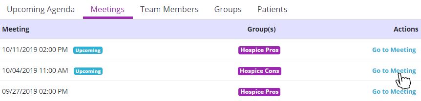 In the IDG Center, users can access the meeting page by clicking Go to Meeting on the right side of the Upcoming Agenda or Meetings tab.