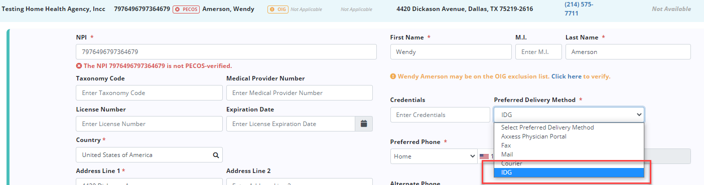 When editing/adding the physician details, select IDG as the delivery method from the Preferred Delivery Method drop-down menu.