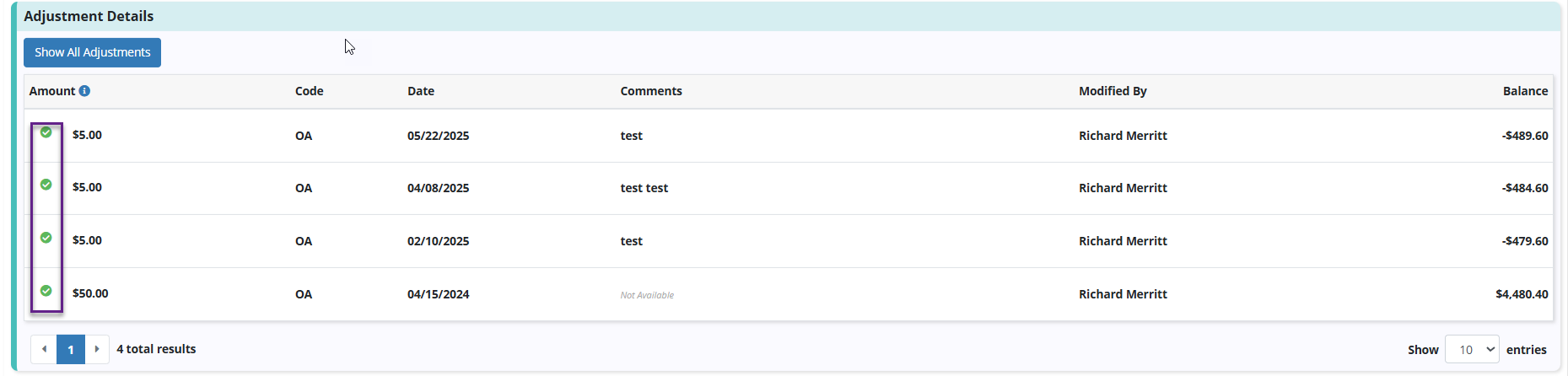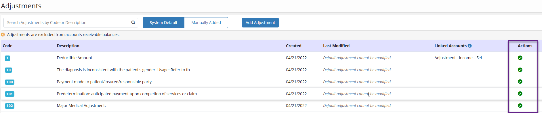 A green checkmark is listed in the Actions column on the Adjustments screen.