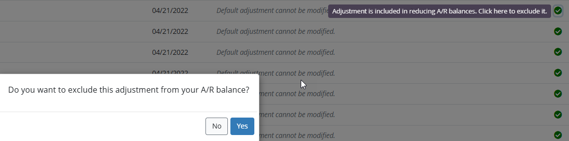 An adjustment with a checkmark is included in the account receivable balance. An adjustment with an X is excluded from the account receivable balance.