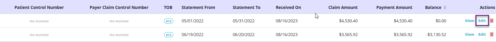 To make an adjustment to a remittance, select Edit under Actions on the linked claim.