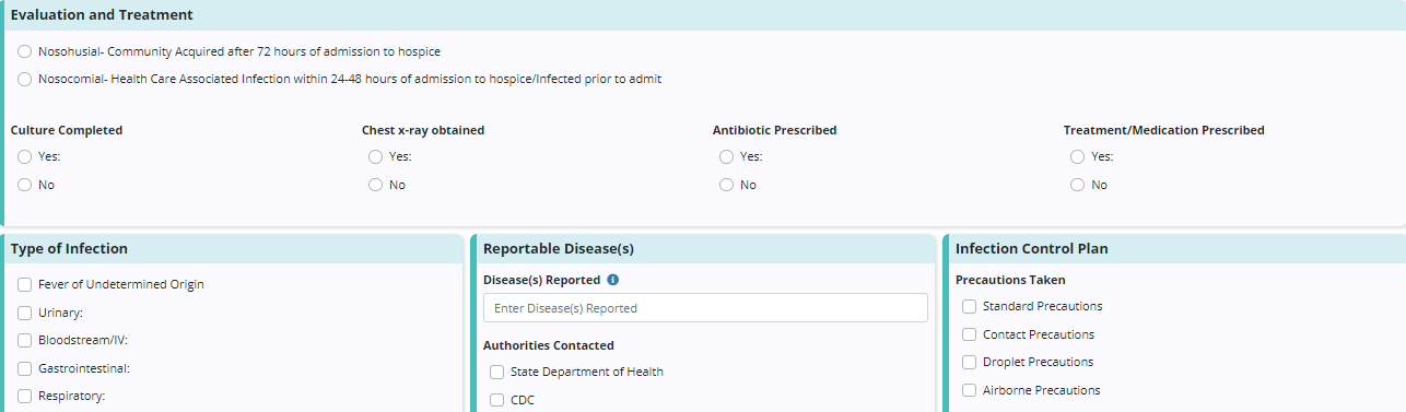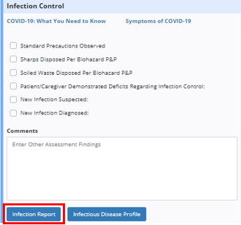 Use the following sections in the infection report to document assessment findings for the diagnosed or suspected infection: