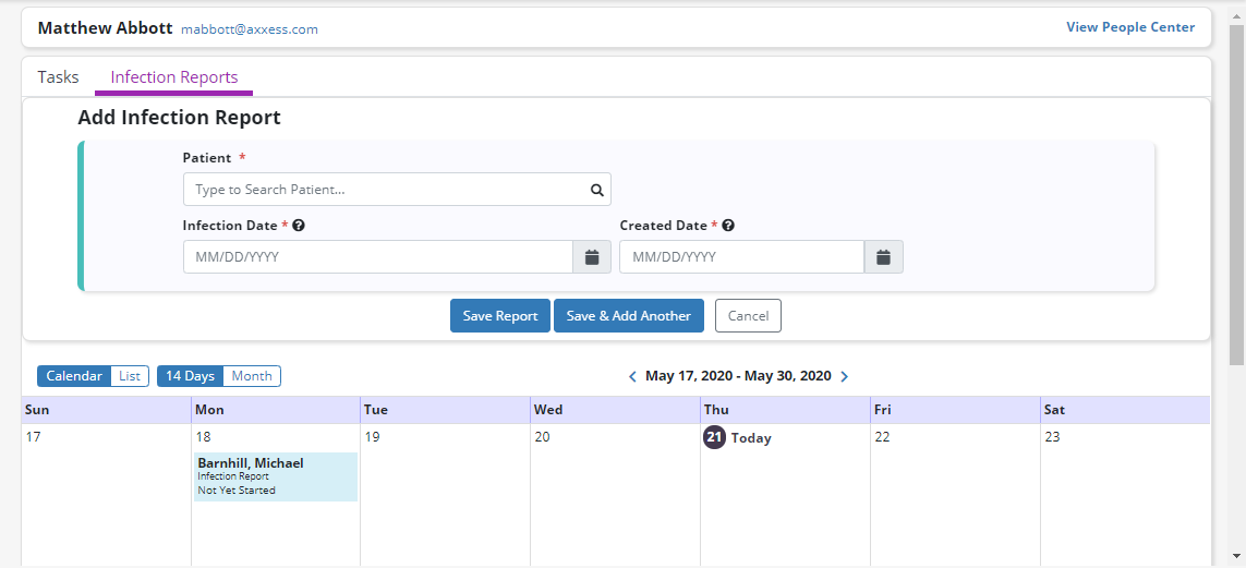 Click Add Infection Report and enter the patient’s name, infection date, and created date for the report.