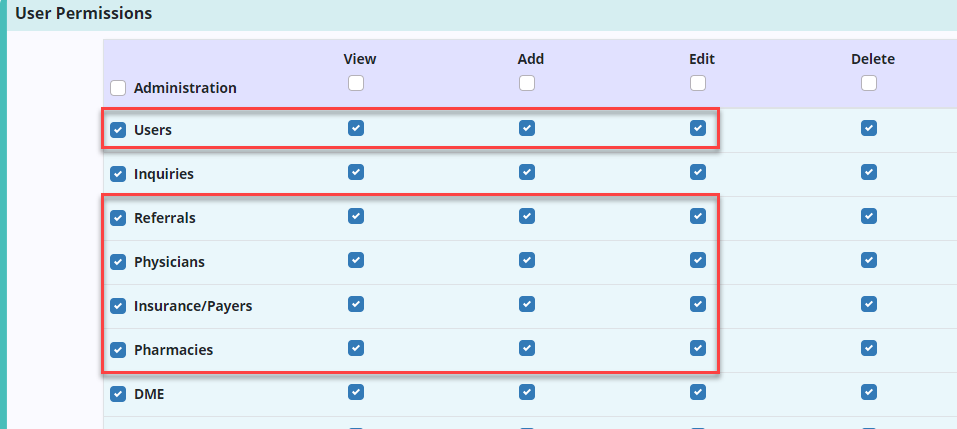 People tab ➜ People Center ➜ Edit ➜ Permissions tab ➜ Administration section ➜ Users/Referrals/Physicians ➜ View/Add/Edit ➜ Save