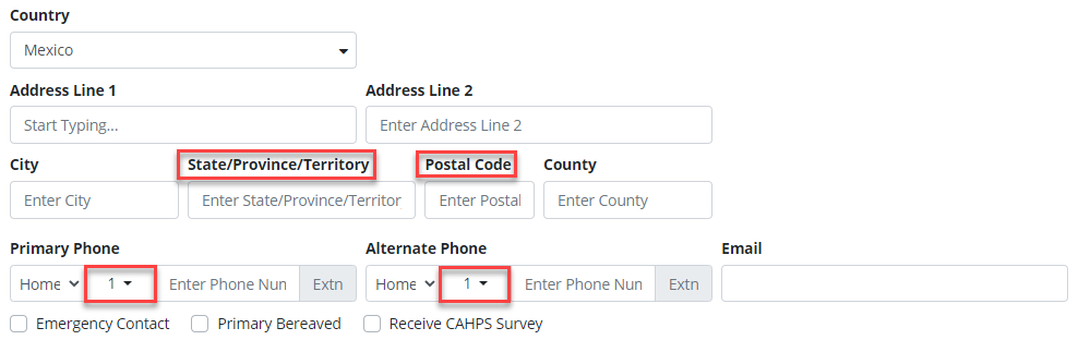 The country code prefix for the Primary Phone and Alternate Phone numbers default to the United States, regardless of the country selected in the Country drop-down menu. If the phone number is not a United States phone number, users can select the applicable country code from the Country Code menu.