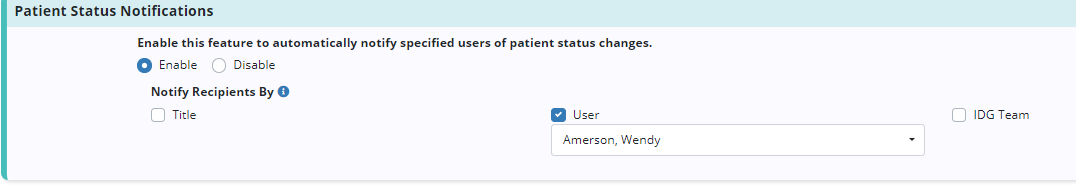 When Notify Recipients By is selected, the following checkboxes will appear: Title, User and IDG Team.