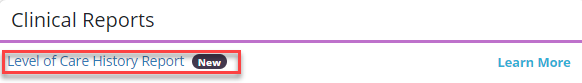 To access the Level of Care History Report, navigate to the Report Center under the Reports tab. In the Clinical Reports section, select Level of Care History Report.