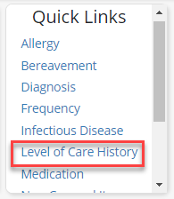 To view a patient’s level of care history, navigate to the patient’s chart under the Patients tab. In the Quick Links menu on the right side of the screen, select Level of Care History.