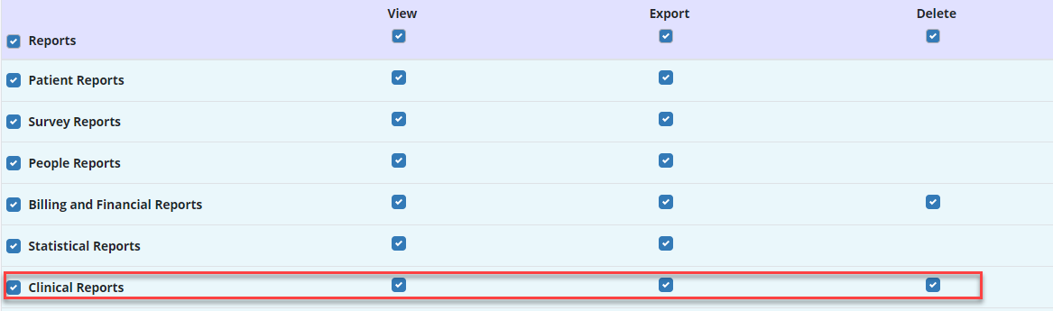 People tab ➜ People Center ➜ Edit ➜ Permissions tab ➜ Reports section ➜ Clinical Reports ➜ View ➜ Save