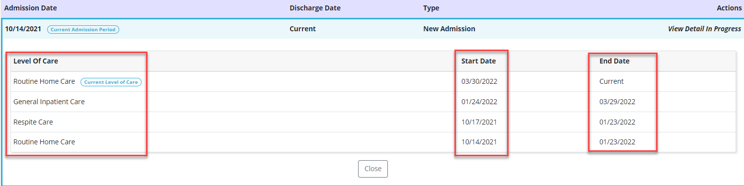 If the patient has multiple admission periods, the levels of care will be displayed with the current level of care to the oldest level of care.
