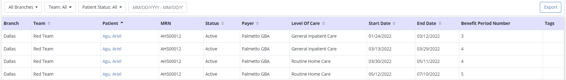Users can filter the report data by provider, team, patient status, payer and/or date range using the filters at the top of the screen. To export the report to Excel, click Export.