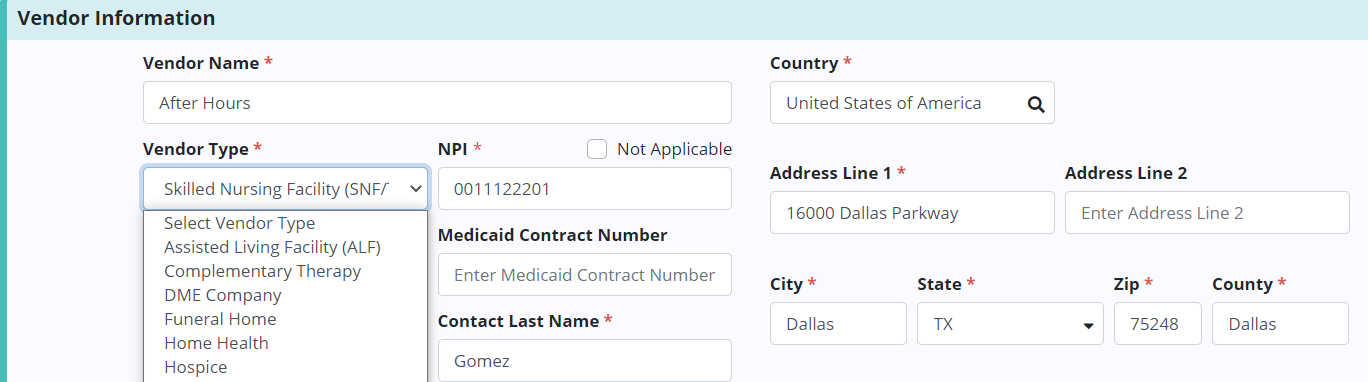 On the Vendor Details tab, select Hospital, Hospice, Nursing Facility or Skilled Nursing Facility from the Vendor Type drop-down menu.