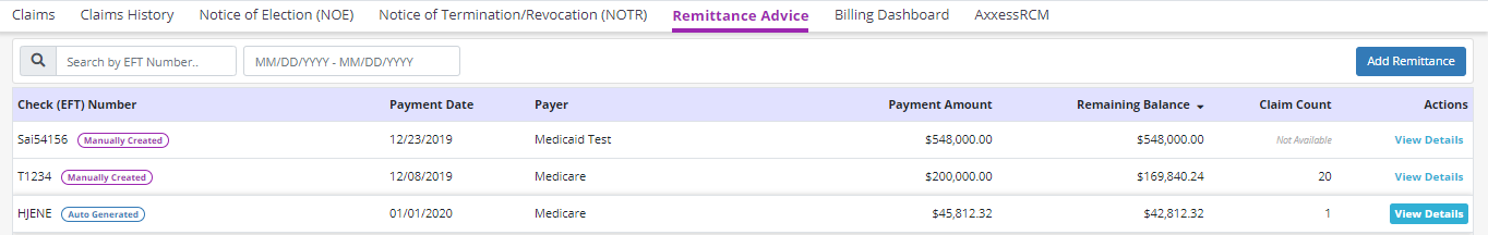 To link claims to or unlink claims from a remittance, navigate to the Billing tab and select Remittance Advice from the drop-down menu. On the Remittance Advice screen, select View Details under Actions to review remittance details for an auto-generated claim.