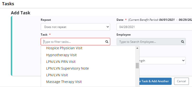 Complete the remaining fields and click Save Task to add the visit to the schedule. These visits will count against the skilled nursing frequency.