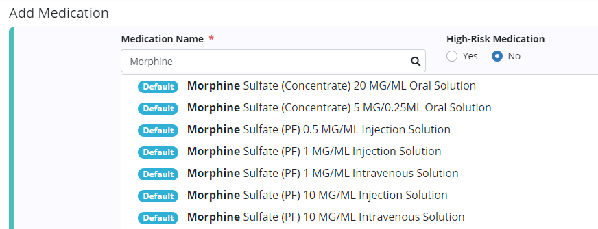 Enter the medication name in the Medication Name section and select the medication from the drop-down menu. The medication name and dosage are pulled from the Medi-Span database.