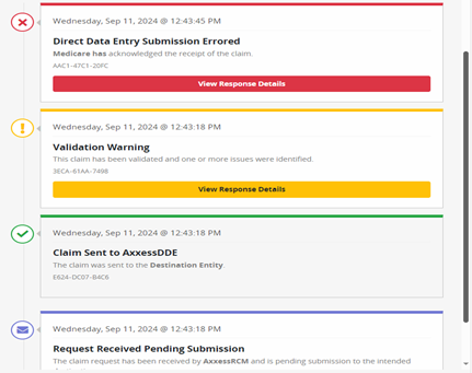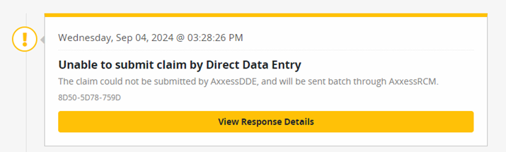 If a claim encounters an issue during submission via DDE, it will be returned to Axxess RCM.