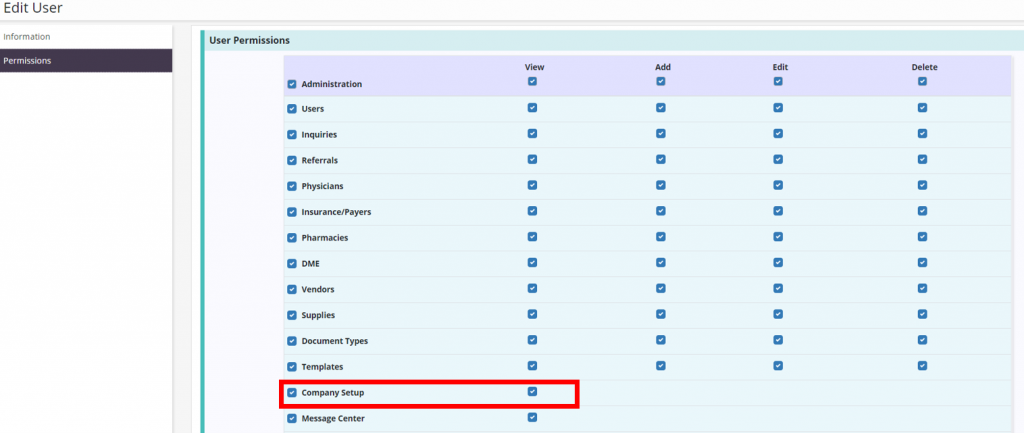 To give a user this permission, navigate to the user’s profile and select Edit. On the Permissions tab, select View next to the Company Setup permission.