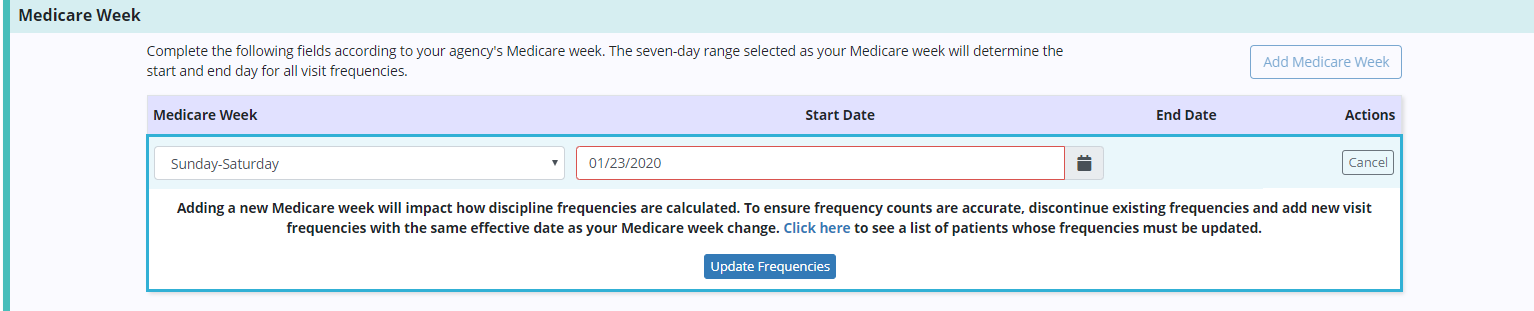 Adding a Medicare week impacts how discipline frequencies are calculated. To ensure frequency counts are accurate, the software automatically checks to see if any active visit frequencies overlap the Medicare week start date. If any active frequencies overlap the start date, the system prompts the user to update the overlapping frequencies.