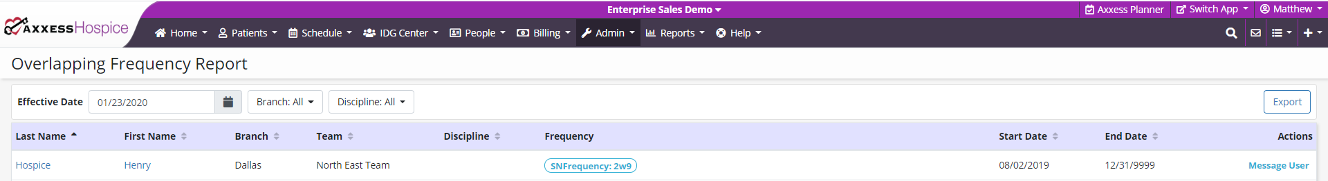 Select the Click here link to open the Overlapping Frequency Report and view a list of patients whose frequencies need to be updated. From the report, select Message User under Actions to message staff and request necessary updates for each patient on the report.