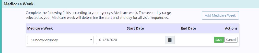 Select a week from the Medicare Week drop-down menu and enter a start date. Click Save to complete the process.
